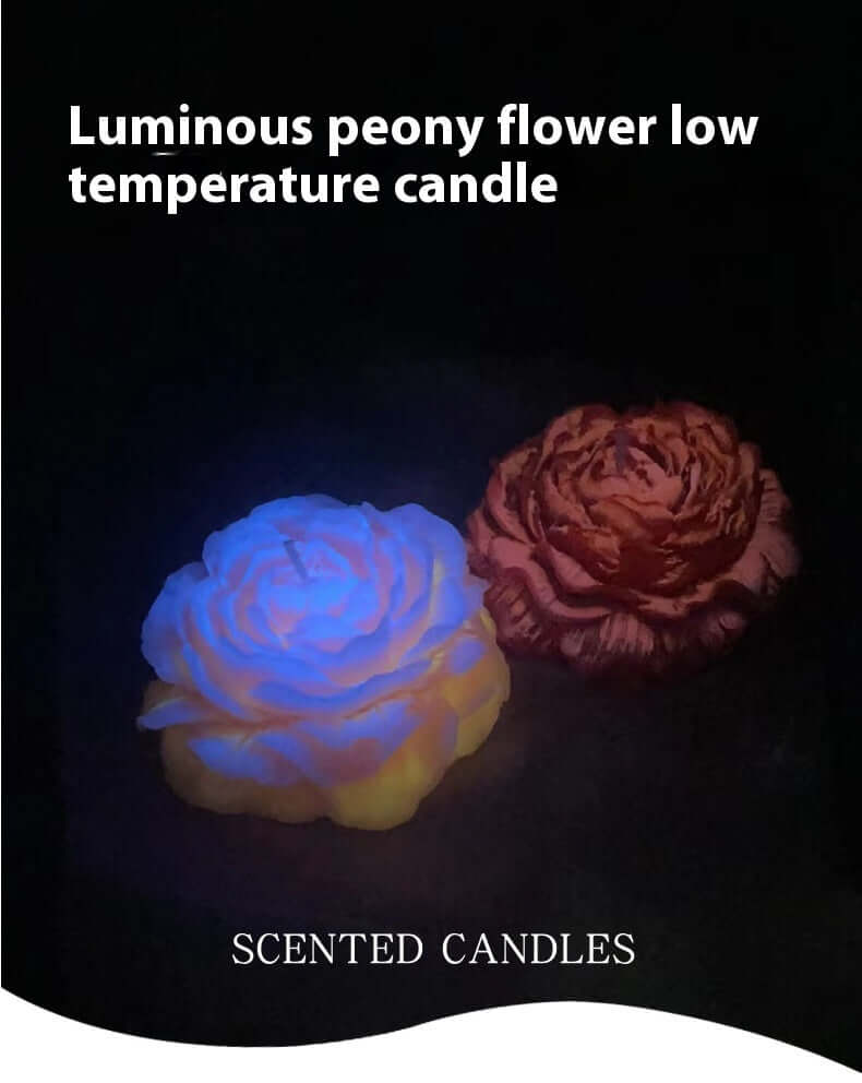 Leuchtende Fluoreszenz-Kerzen mit Pfingstrosenblüten bei niedriger Temperatur