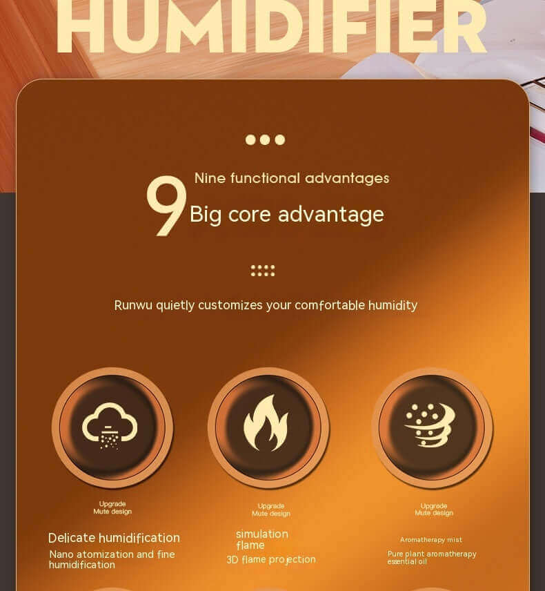 Verwandeln Sie Ihr Zuhause mit atemberaubend realistischen Flammeneffekten in eine gemütliche Oase. Durch die perfekte Mischung aus LED-Lichtern und Nebel werden Sie sich fühlen, als würden Sie sich an einem warmen Kamin zusammenrollen. Wählen Sie zwischen der zweifarbigen Lichteinstellung in Rot und Blau und fügen Sie sogar ätherische Öle für ein wirklich intensives Erlebnis hinzu. Und dank des ultraleisen Betriebs stört dieser Luftbefeuchter weder Ihren Tagesablauf noch Ihren ruhigen Schlaf. Schließen Sie ihn einfach über USB an und genießen Sie die sanfte Aromatherapie und den beruhigenden Nebel bis zu 8 Stunden lang. Dieses Gerät ist für Räume bis zu 10 Quadratmetern konzipiert und wertet jeden Raum in Ihrem Zuhause auf. Vertrauen Sie uns, Sie werden diese innovative und praktische Ergänzung Ihrer Inneneinrichtung nicht missen wollen.