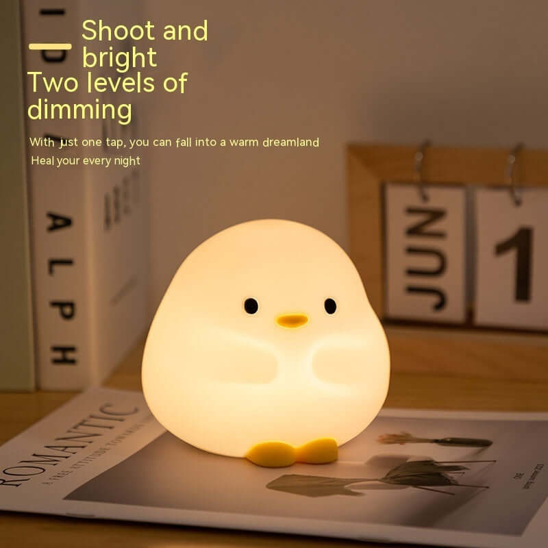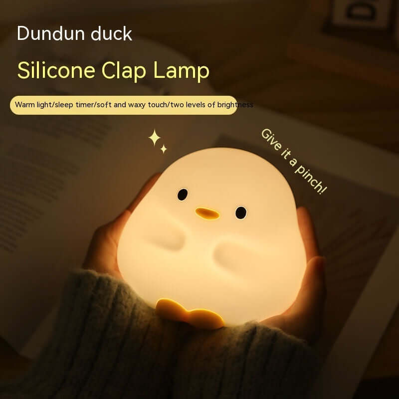 This bedside night light is made with premium quality Silicone, ensuring durability and guaranteed quality. It features bright and gentle LED light beads that are energy-saving and eco-friendly. With warm light and 2 adjustable brightness levels, it provides a soothing and eye-protecting experience for night routines or relaxation. Simply tap the shell to switch between brightness levels, making it a creative household must-have. The lamp can be easily charged via USB (built-in 800mAh) and can be powered by a power bank or any adapter. Its cute cartoon duck design adds a touch of fun and charm to any room, making it a great gift for children's birthdays or Christmas. The lamp's dimensions are 125mm * 105mm * 110mm, and it operates on a voltage of ≤ 36V. Charging time is approximately 4 hours, and the usage time can last up to 11 hours on high gear and 45 hours on low gear. This package includes 1 lamp and 1