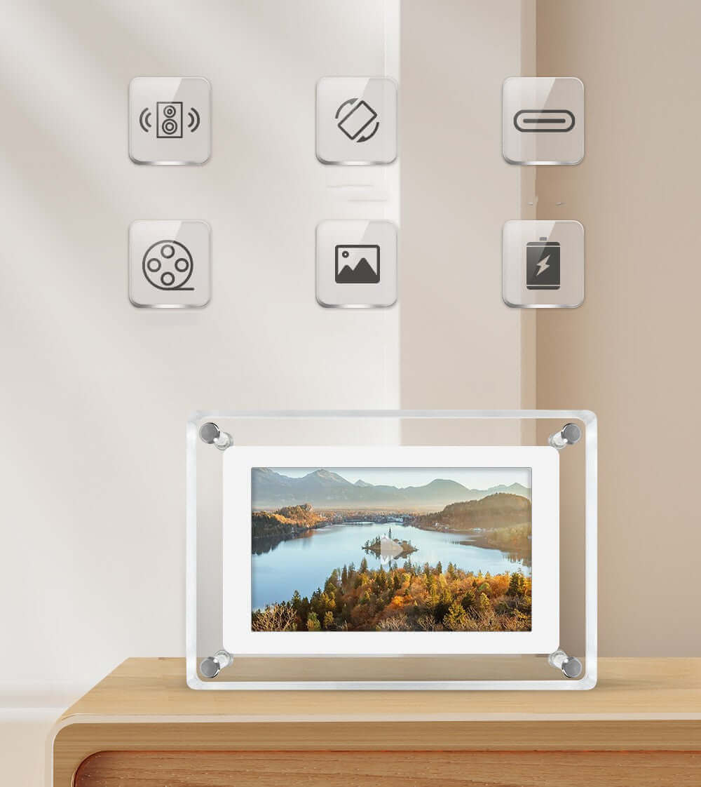 Experience the ultimate display with our 5-inch Acrylic Digital Photo Frame Decoration. Crafted from premium acrylic material and featuring an anti-dumping rear bracket, this frame boasts a full angle IPS screen and supports 1080p ultra-clear playback. Get lost in the stunning resolution of 854X480 and showcase your favorite memories in style. Upgrade your home decor with this stylish and modern photo frame.