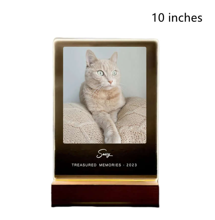 Add the perfect touch to your home decor with a stunning Personalized Pet Commemorative Plaque. This beautiful desktop ornament is perfect for displaying your beloved pet's photo and will be a cherished treasure for years to come. Choose from 7, 8, or 10 inch sizes and a variety of LED beech and peach wood bases to create a unique and personalized piece. Show off your love for your furry friend with style and elegance.